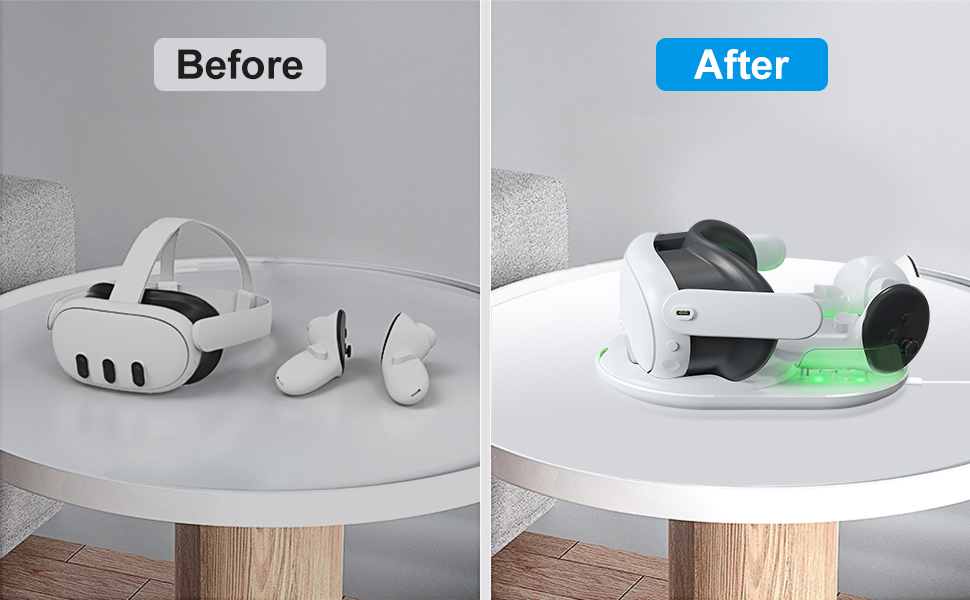 - LED Indicators: The quest 3 charging dock has designed LED lights to indicate the charging status of the headset and touch Controllers,The Charging Station is Orange when charging, Green when fully charged,allowing you to quickly check the charging status