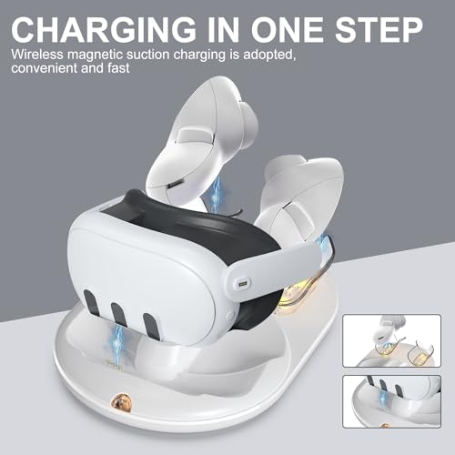 - All-IN-ONE Charging Design: Our charging dock is specifically designed for Meta Quest 3. And the charging dock station for Meta Quest 3 is quickly and easily charge a VR headset and 2 controllers simultaneously.NOTE:Charging with any third-party protective accessories(protective cover, eye mask) is not supported