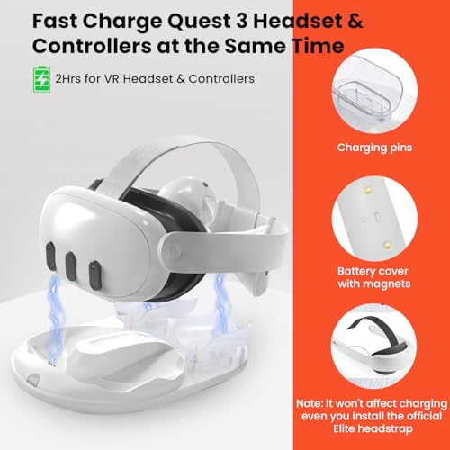 - 【All-In-One Charging】The charging dock is specially designed for meta quest 3 VR charging station can quickly and easily charge 1 VR headset and 2 VR grip handles at the same time, The left and right handles can be fully charged in 1.5 hours, and the console can be fully charged in 3.5 hours.