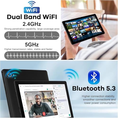 - 【Wi-Fi 6+Bluetooth 5.3+Split-Screen】 This Android 14 tablet supports WiFi 6 and Bluetooth 5.3, built-in 5G WiFi and 2.4G WiFi dual-band WIFI chip for more stability; Bluetooth 5.3 for faster and more stable connection with other Bluetooth devices. The tablet also supports split-screen functionality. And smoothly use the tablet!