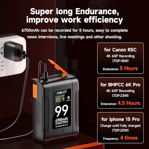- 【High Capacity】: Equipped with a 6700mAh lithium battery (99Wh/14.8V), which provides enough power for long-term video recording or film production. For example, it can power the Canon EOS R5C for about 5 hours of video recording, the BMPCC 6K Pro for about 4.5 hours of video recording, and the iPhone 15 Pro four times.