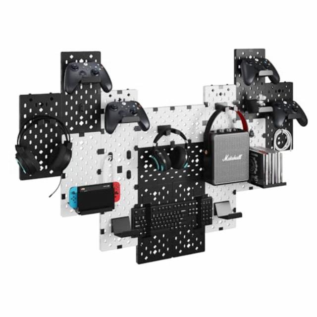 - VERSATILE PEGBOARD ACCESSORIES: Equipped with various pegboard accessories, including game controller holders, universal headphone holders, cable hooks, keyboard holders, and adjustable disc shelves; The controller holders feature silicone protective pads and are compatible with PS5, PS4, Xbox, and Nintendo controllers.