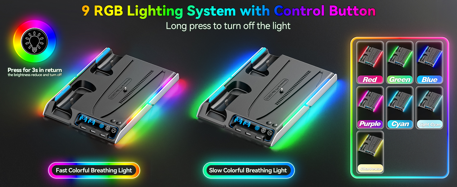 - 3 COOLING FAN & 7 RGB LIGHT: Featuring an integrated turbo fan, ps5 slim cooling station provides a touch-sensitive FAN button for convenient 3-speed heat dissipation adjustment. Playstation 5 cooling system expels hot air from the side.Easily switch between 7 vibrant RGB colors with a short press on RGB button. Adjust brightness or turn off lights by long-pressing the RGB touch button,and remember previous light mode after a restart. It's a ideal soporte ps5 slim gifts for gamers men.