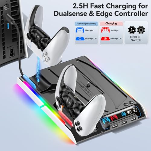 PS5 Slim Stand with Cooling Station for PS5 Slim Disc & Digital Console, PS5/Edge Controller Charger Gaming Accessories, PS5 Stand with Cooling Fan, PS5 Controller Charging Station RGB Ligh