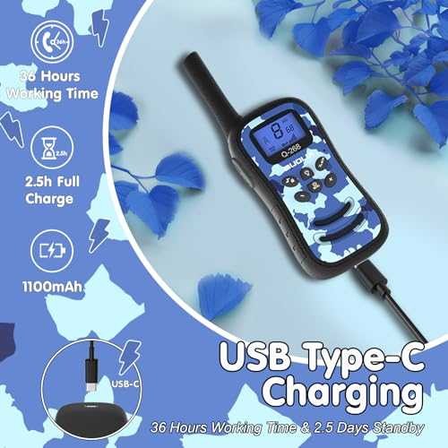 - 【Built-in Safe Batteries,】You don't need to provide and regularly change batteries, our radios walkie talkies for kids are built-in 1000mAh(non-removable) safe rechargeable Li-ion batteries, so you could charge them by USB cable (INCLUDED) or power bank. It will greatly save your money for changing the battery. The chargering time ia about 3.5 hours. With the long battery life, the rechargeable walkie talkie for kids support up to about 36 hours of talking time and 2.5 days of standby.