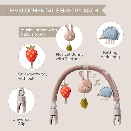 - SENSORY PRAM ARCH – Our baby musical arch is not just an adjustable toy bar for strollers, cribs, prams, bouncers, bassinets, and car seats, but it also features melodious tunes that entertain and stimulate your baby's auditory senses. The electronic musical baby toy is activated by your baby’s kicks, teaching them about cause and effect. This unique addition promotes sensory development and encourages deeper sensory exploration, making every outing a symphony of sounds for your little one.