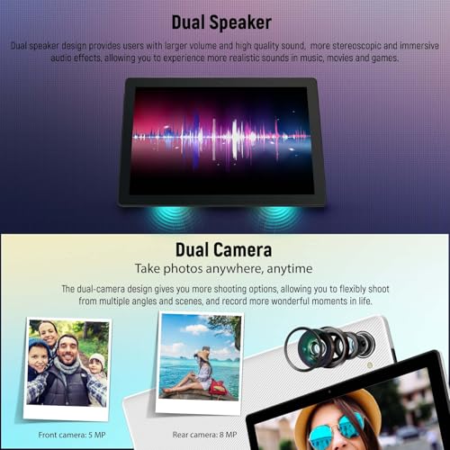 - ⭐【Multifunctional Configuration】 The android tablets with lightweight and slim design, only 9mm thin body, light and easy to use.The 10 inch tablet is equipped with a 1280X800 HD high-resolution touchscreen, lifelike colors and clearer pictures, bringing you the best visual experience. Equipped with a clear 5-megapixel front camera and 8-megapixel rear camera. Support split-screen function, You can simultaneously view a video and send a message, no need to exit the application.