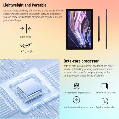 - ⭐【Widevine L1 + HD Display】The 10-inch tablets boasts high-fidelity colors, high-transparency screen display, and highly sensitive touchscreen experience, making the world on the screen more vivid and friendly. Meanwile, the android tablet supports streaming HD quality content on Netflix, HBO, Disney+, and other streaming services, providing you with an ideal viewing experience.The high-quality screen contributes to the slim body of this tablets,weighting only 480g, measuring 9mm thick.