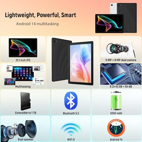 Android 14 Tablet, 10.1 inch Tablets with 1280 * 800 IPS HD Touchscreen, Octa-Core Processor, 8GB RAM + 64GB ROM (Expand to 1TB), BT 5.0, Dual 5MP+8MP Camera, 2024 Upgraded Version (Black)
