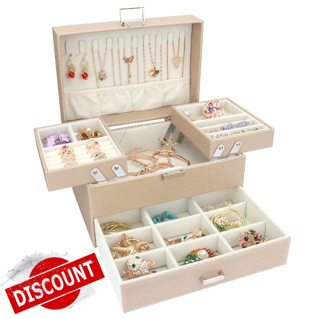 Jewellery Box Organiser, 3 Layer PU Leather Jewellery Case, Large Jewellery Organiser with Drawer, Jewellery Storage Case for Necklaces Earrings Bracelets and Rings, Beige