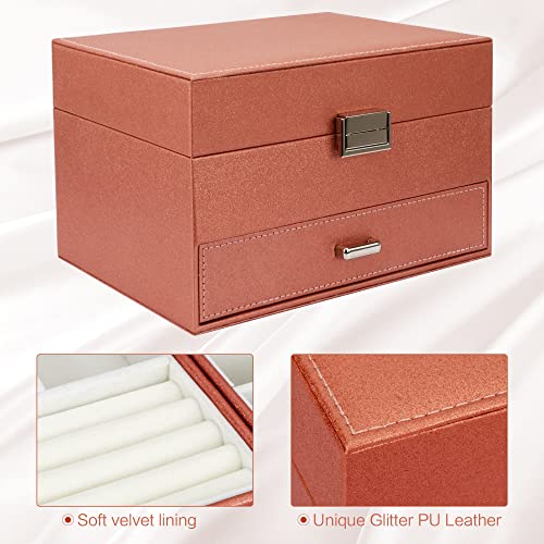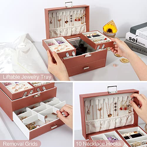 Jewellery Box Organiser, 3 Layer PU Leather Jewellery Case, Large Jewellery Organiser with Drawer, Jewellery Storage Case for Necklaces Earrings Bracelets and Rings, Rose gold