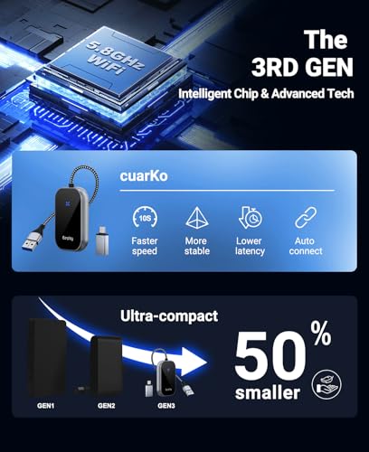 - 【Enhanced Performance】Carplay Wireless Adapter equipped with 2024 advanced core chip, with 5.8 GHz Wi-Fi and 5.3 Bluetooth, wireless CarPlay adapter offers transmission rates up to 30%,delivering a powerful and rapidly wireless connection,faster than other systems.Enjoy minimal interruptions and delays, ensuring real-time synchronization and responsiveness between your Phone and car display screen.