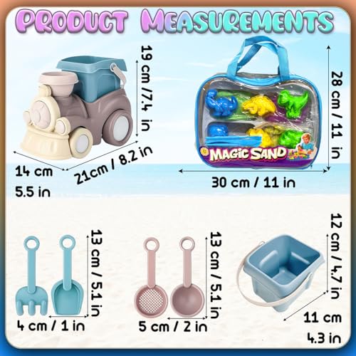- Dinosaur-Themed Playset: The set of 22 Pieces comes with a train bucket, 8 distinct dinosaur moulds, a carry case bag, 7 sturdy sand tools, and 1kg of colourful, non-toxic magic sand to inspire unlimited imaginative play.