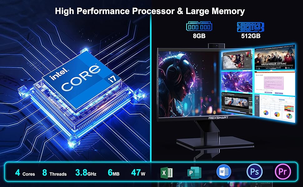- 【Efficient processor and large memory】NX1 PRO all-in-one desktop computer is powered by Core i7 processor (Up to 3.80 GHz ) 6MB smart cache 4 cores and 8 threads, 8GB RAM DDR3, 512GB SSD.Memory can be expanded to 1TB through removable SSD Slot, making data movement more convenient.
