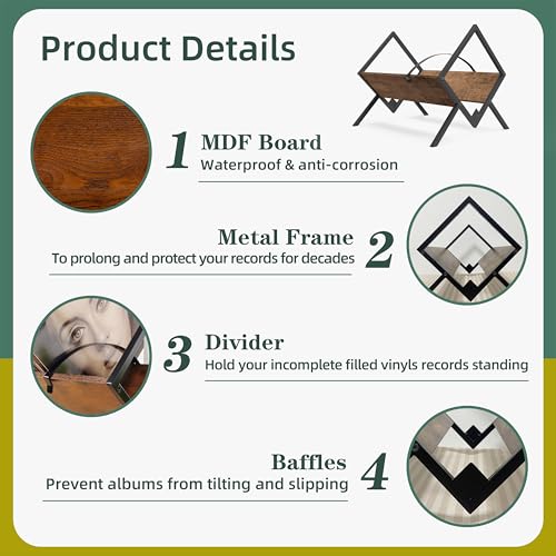 - Vintage Elegance: Our vinyl record holder boasts a captivating design that marries a rich brown particle board with a sleek matte black iron frame. This striking contrast not only provides visual appeal but also evokes a nostalgic charm, ensuring your vinyl storage is as stylish as it is functional.