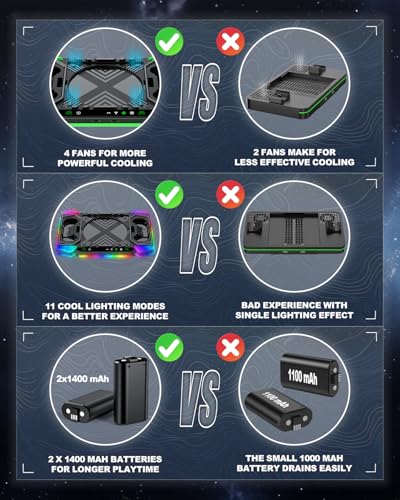 - ❤️All in One Accessories for Xbox Series — 4 high-performance cooling fans keep console at optimal temperatures. The dual charge stand comes with 2 rechargeable batteries, ensuring your controllers are always ready for action. With 11 REG light modes, you can personalize your gaming environment to suit your style. The accessory also offers a headset stand, 2 expansion card slots, and space to neatly store up to 6 game discs, helping you keep gaming area organized.