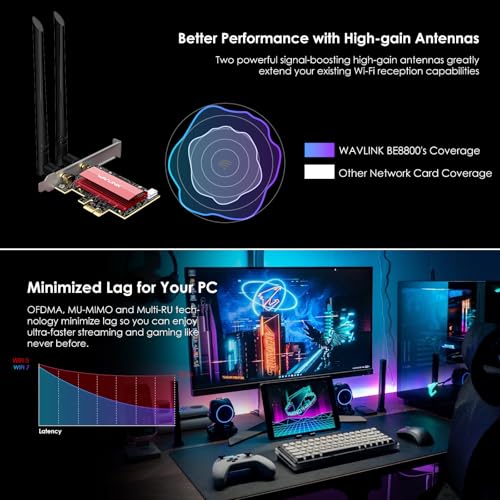 - 【Pioneering Wi-Fi 7 Technology】 Empowered by Wi-Fi 7, this card unleashes the complete capabilities of the 6 GHz band, offering outstanding bandwidth and dedicated, congestion-free channels tailored for your desktop. With enhancements like 4096-QAM and 320MHz, this adapter achieves staggering wireless speeds, enabling seamless playback of multiple media streams at once.