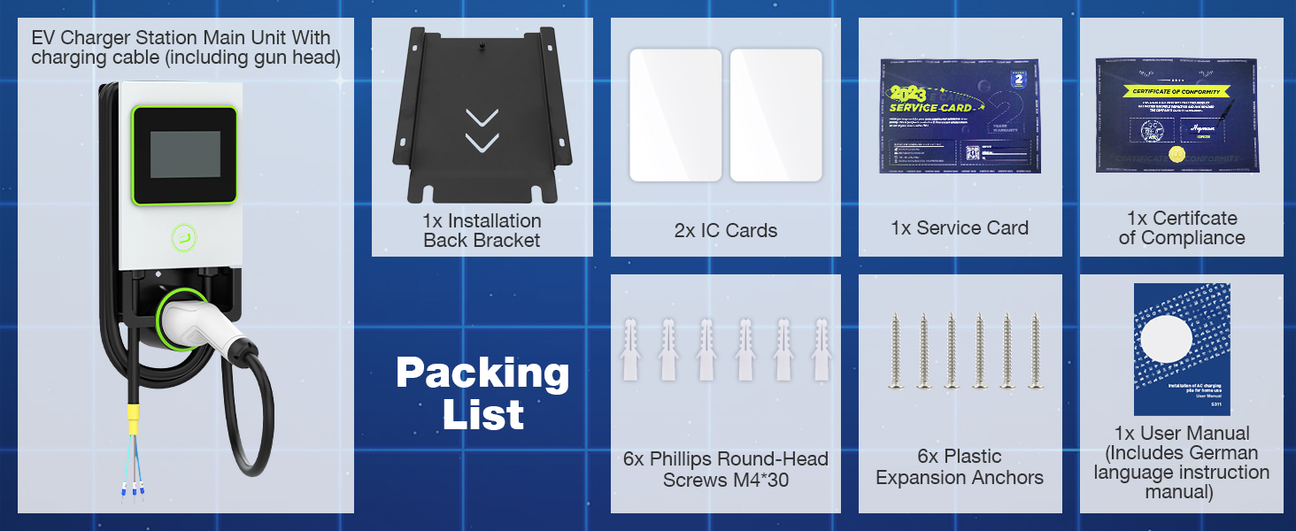 - 【Multi-Language Selection & Packing List】: English, German, French, Italian, Spanish,Chinese. Easy to operate, you can choose the language of the electric vehicle charging station display according to your needs. Greatly improve your convenience. Packing list list: main unit × 1, mounting backplane × 1, accessories required for installation, 2 IC cards, 1 warranty card, 1 certificate of conformity, 1 user manual (with German instruction manual)