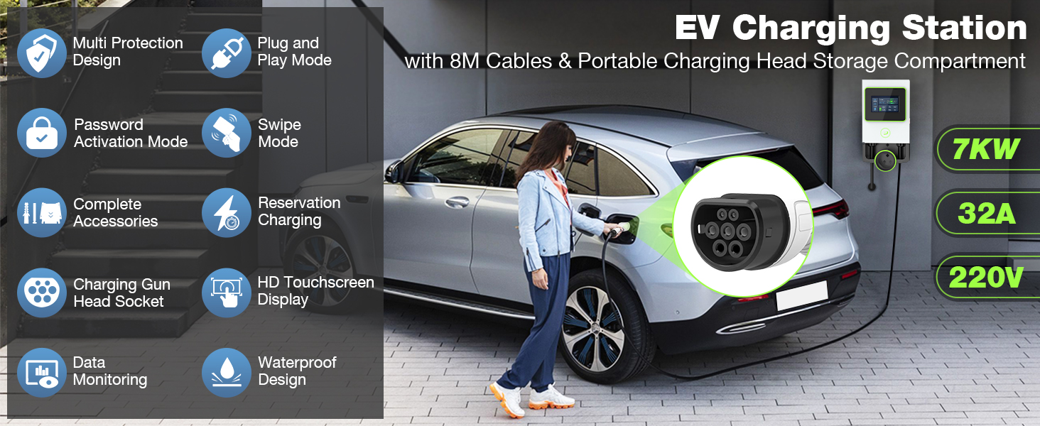 32A EV Charger Charging Station Level 2 7KW LCD Display Electric Vehicle Charger 5 Charging Modes 6 Languages 8m Cable Length IP66 Waterproof IEC 61851
