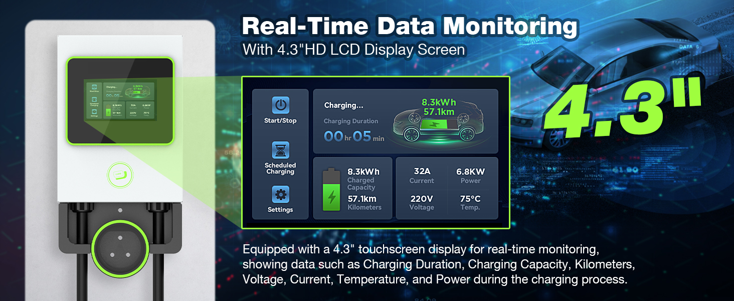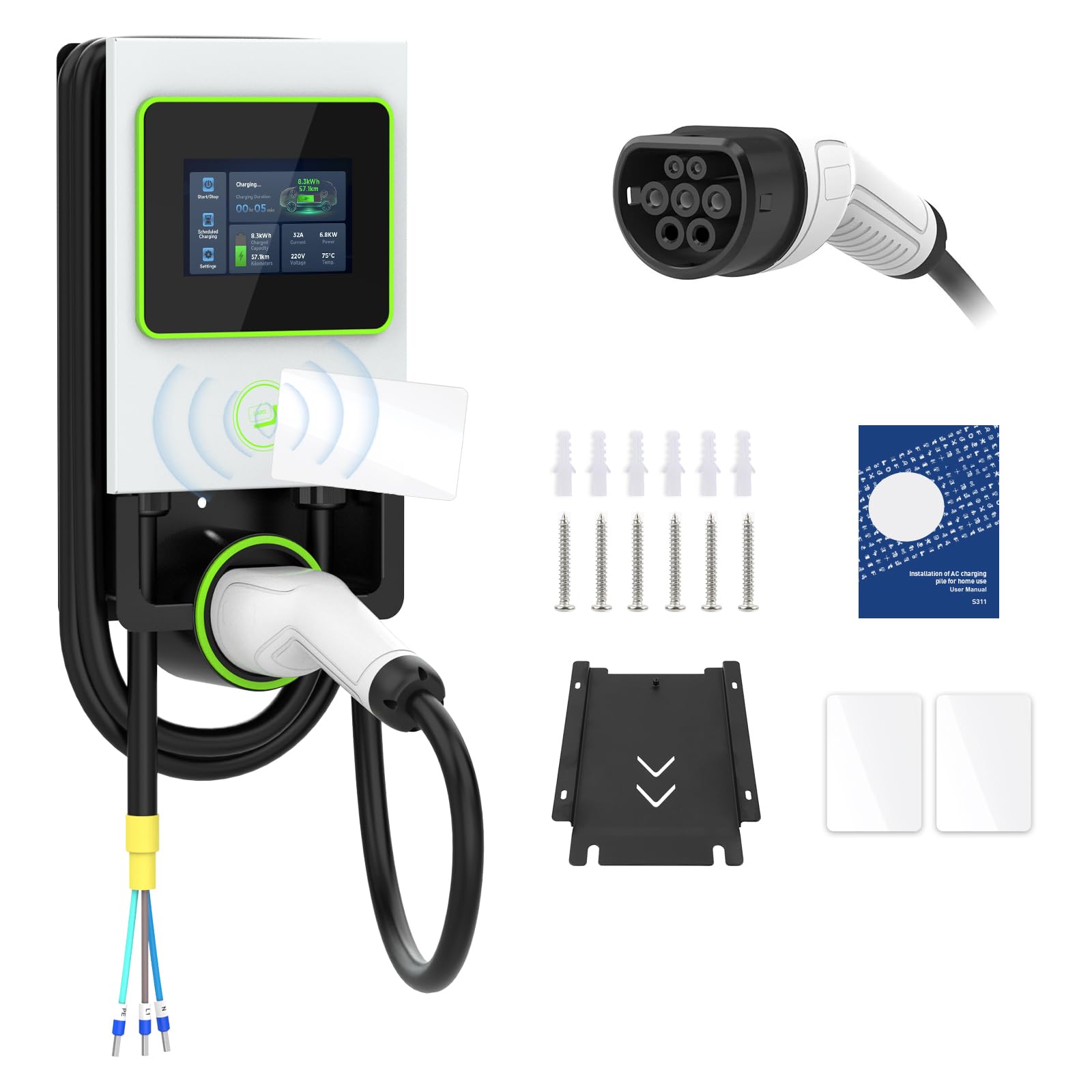 32A EV Charger Charging Station Level 2 7KW LCD Display Electric Vehicle Charger 5 Charging Modes 6 Languages 8m Cable Length IP66 Waterproof IEC 61851