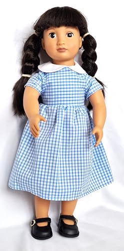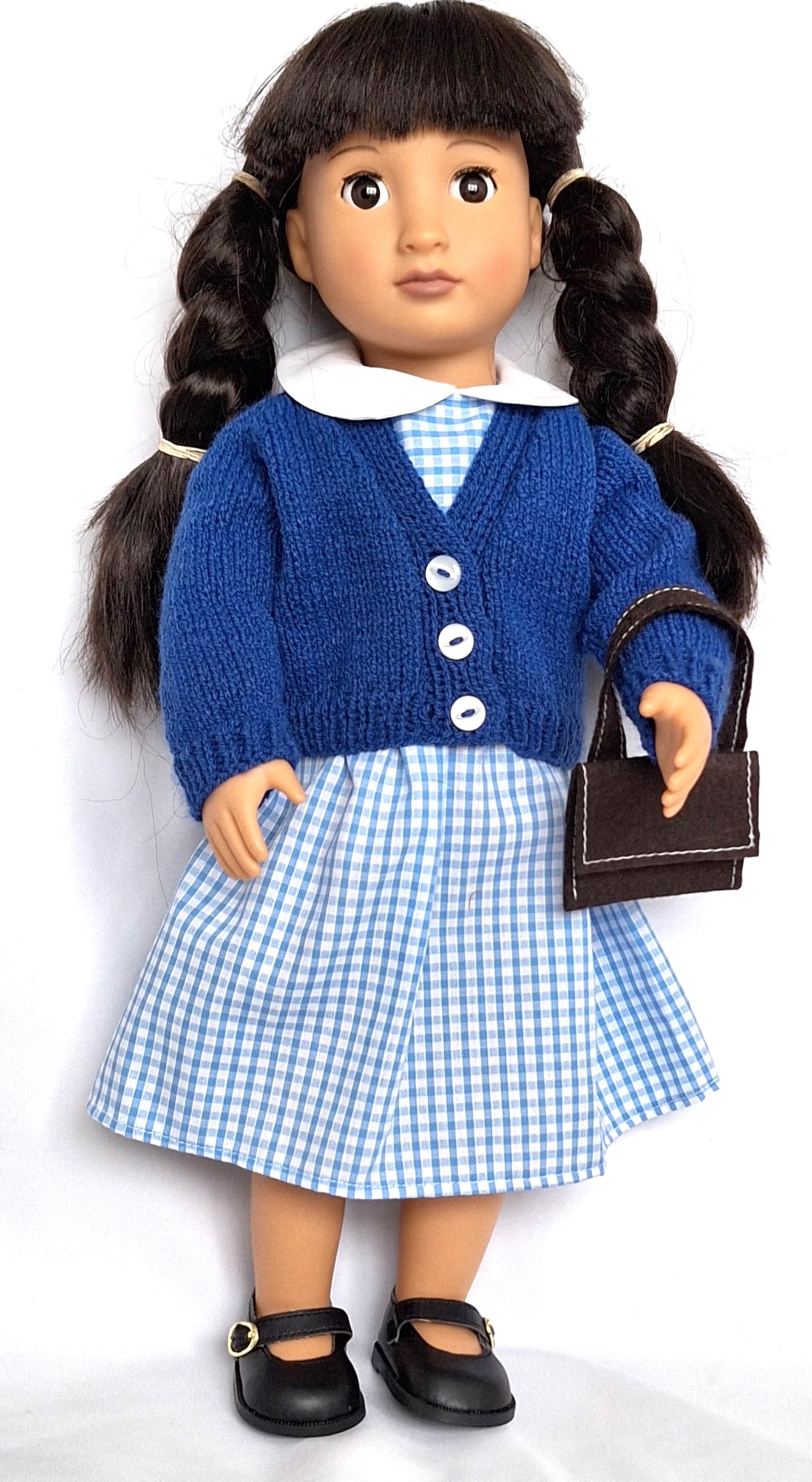 Blue gingham school uniform with cardigan, shoes and bag to fit 18″ dolls like Designafriend, Our Generation etc