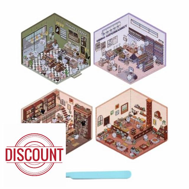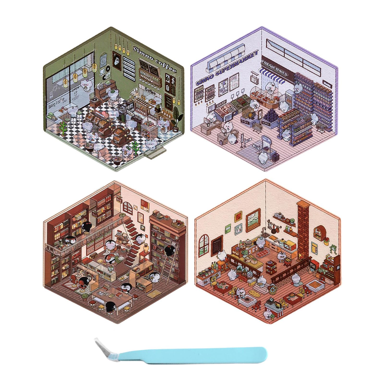 - Diy 3d House Stickers: Diy 3d House Stickers has 4 themes: supermarket, coffee shop, bookstore and restaurant. Comes with a pair of tweezers