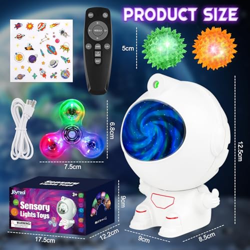 - 【Sensory Lights Toys】Joyreal sensory light set contains 1 astronaut projector, 1 fidget spinner, 2 spiked balls. They can help autism and ADHD patients get soothing, and can also be used as bedroom night lights, party atmosphere lights.