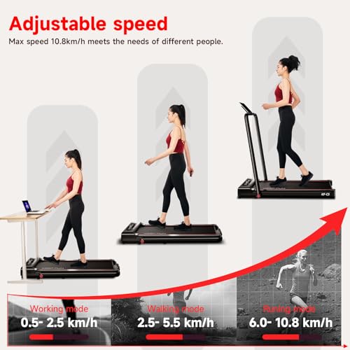 - 【Walking Treadmill With a Powerful Motor】The powerful 2.5 Horsepower Motor provides a large carrying capacity of up to 136kg(300lbs). The portable Walking Treadmill allows you to run up to max speed 10.8km/h, 0.5-2.5km/h working mode, 2.5-5.5km/h walking mode, 6-10.8km/h running mode,enough to meet your needs!
