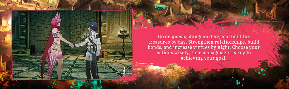 - Go on quests, dungeon dive, and hunt for treasures by day, Strengthen relationships, build bonds, and increase virtues by night, Choose your actions wisely, time management is key to achieving your goal