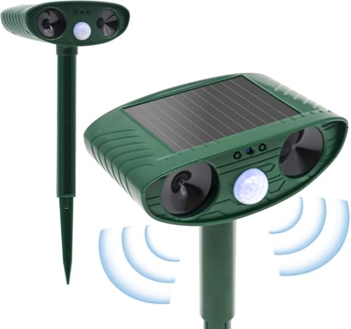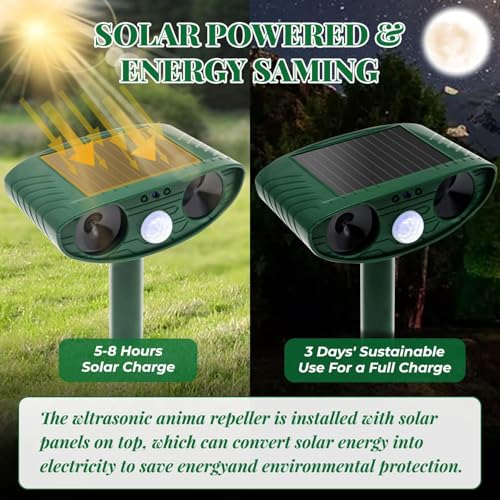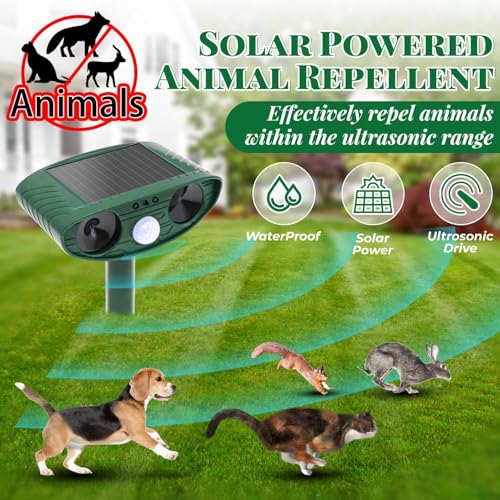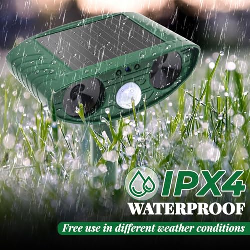 - ✴️【IPX4 Waterproof and Solar Powered】- This cat repellent is made of high-grade ABS material with sturdy construction and beautiful craftsmanship. There is a solar panel on the top of the device, you can use solar energy to charge the battery. The ultrasonic animal repellent is designed with IP44 waterproof, you can use it in any bad weather to keep your farm, garden and lawn free from harmful animals.