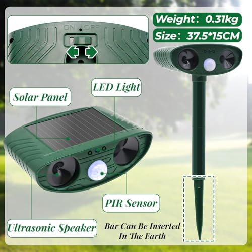 - ✴️【Easy Installation】- The solar powered ultrasonic cat repellent has 3 removable grounding stakes that can be easily inserted into the soil and you can adjust the height as needed. In addition, there is a hanging hole on the back of the cat repellent, you can also hang it on a tree, fence or wall. A simple operation will effectively keep your outdoor space free from pests.