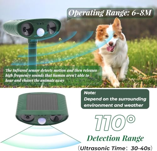- ✴️【Working Principle】- The solar cat repeller is equipped with a highly sensitive motion detection sensor that covers a wide angle of 110 degrees with a detection range of 25-33 feet. The cat repeller adopts infrared detection principle and emits ultrasonic waves to repel small animals while detecting them within the detection range. It can help you stay away from pesky stray dogs, stray cats and other small animal nuisances, thus protecting your property, garden and your yard.
