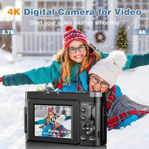 - 【Perfect Gift & Warranty Support】The vlogging camera with simple, intuitive control meets all your daily shooting needs with ease and is also a perfect gift for teens, adults, amateurs, teens, and seniors on Christmas and birthdays. Package List: 4K camera, two batteries, 32GB memory card, HDMI cable, USB cable, lanyard, lens cover. Two year hassle-free warranty- refund and replacement.