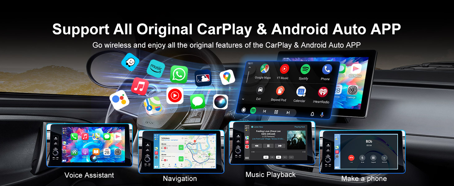 - [Original Function] The ESSGOO Wireless 2-in-1 CarPlay Dongle allows you to enjoy the convenience of wireless A-pple CarPlay & Android Auto while retaining all their original functions. You can use Siri & Google Assistant, real-time navigation, play music, make voice calls, mirror screens, watch videos, and more.
