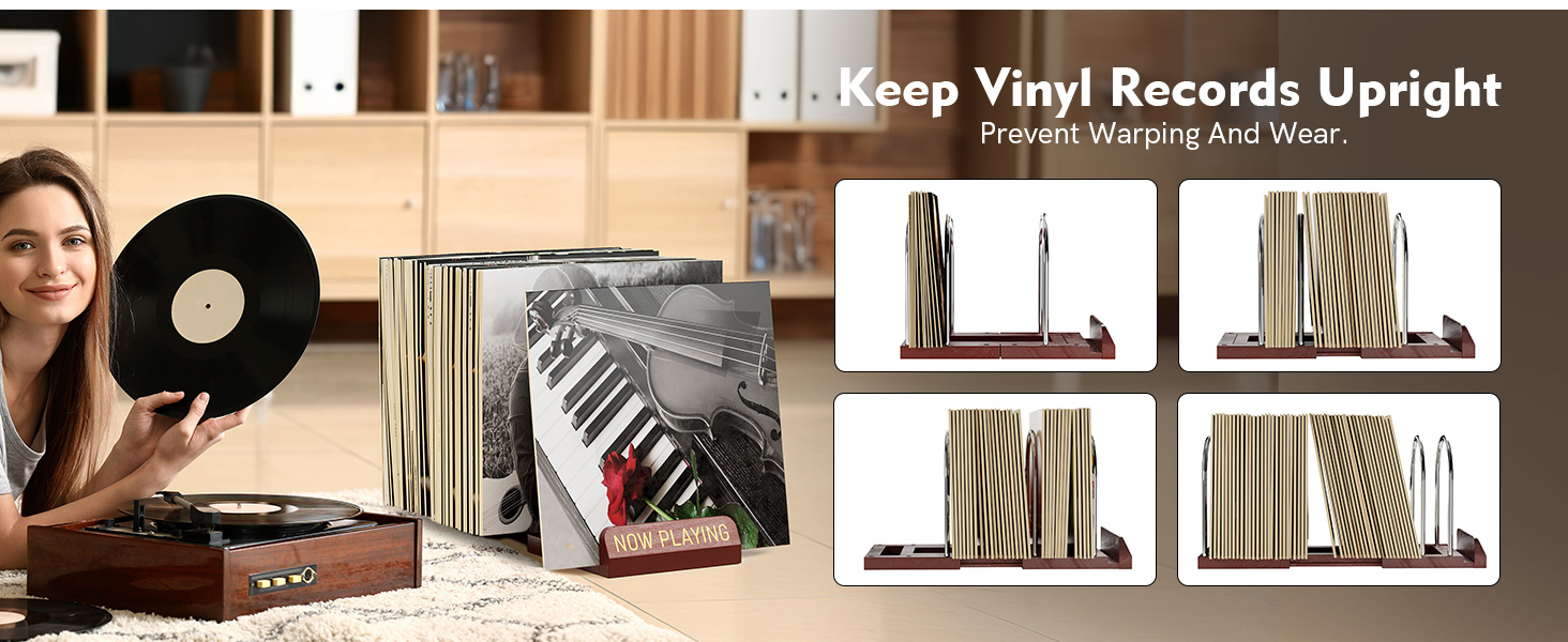- "Now Playing" Groove to Show Off What's Spinning: This record holder features a dedicated slot to display your current favorite album cover, adding a stylish and personal touch to your space. Showcase your spinning record while sharing your music with guests, making your listening area both fun and unique
