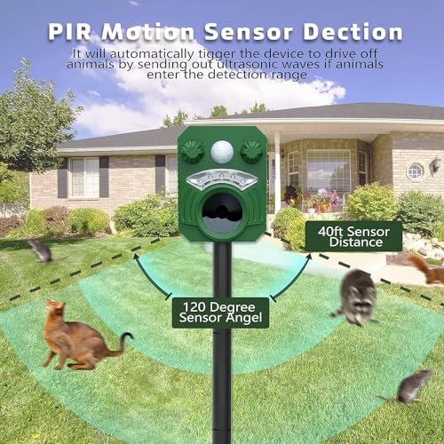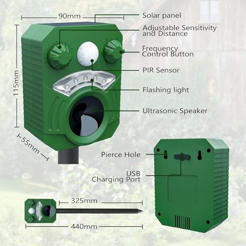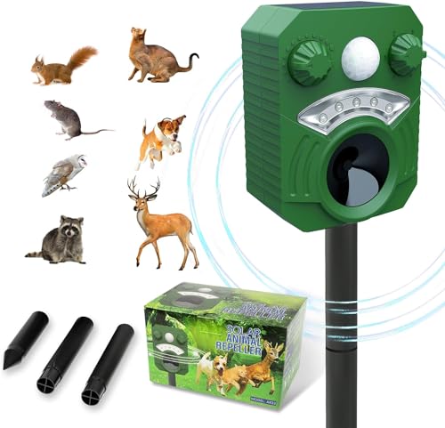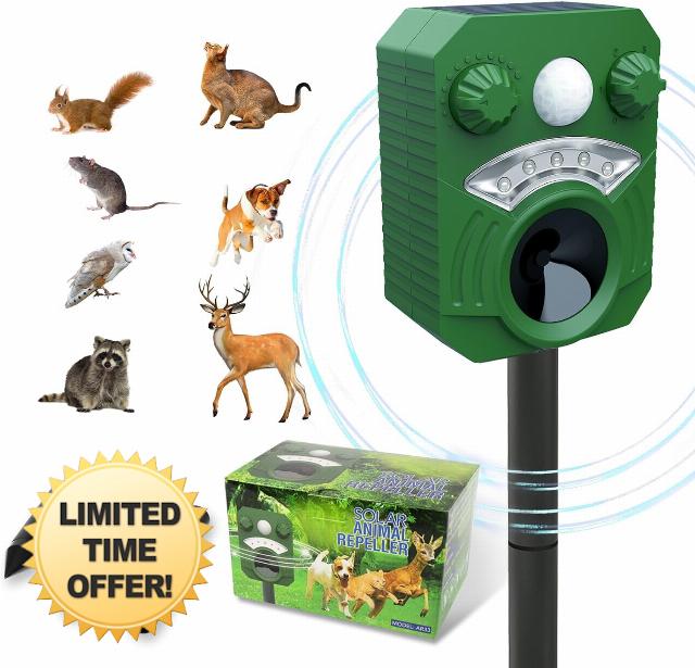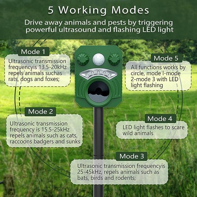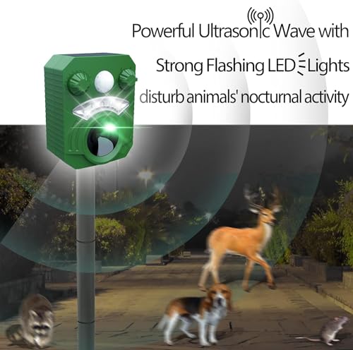 - 【Harmless and Humane】: Ultrasonic solar animal repellent is designed to repel small animals in a chemical-free and humane way, rather than injuring and killing, perfect for those who are bothered by animals but don't want to cause any harm. The effective working distance is 8 meters and the effective range is 110°.