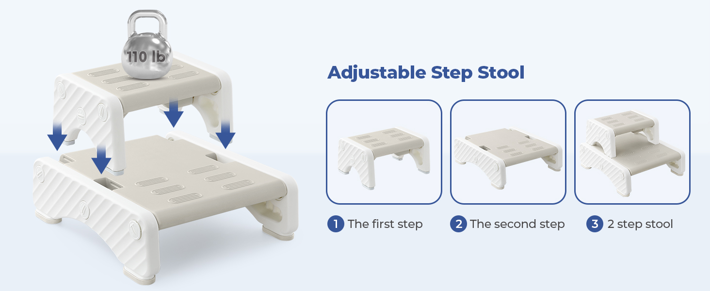- 2-in-1 Toddler Stool: This Toddler Step Stool can be separated into 2 pieces small kids step stool which can shared to brothers and sisters, and also can be assembled into one bigger higher toddler 2 step stool to reach the toilet as potty training, reach the sink to wash hands or brush teeth, reach the closet/drawer/shelf to get stuff or kitchen counter as kitchen helper, which make kids more independent and curious.
