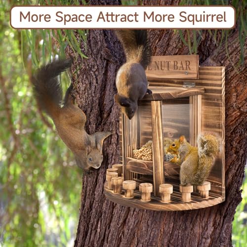 - 【Funny Styling Design】With 9 spacious stools, our nut bar squirrel feeder provides a cosy dining space for multiple squirrels.With a cute design with a 'THE NUT BAR' at the top, the cute squirrel bar adds a unique view to your yard, and you can interact with squirrels and experience the beauty of nature with your children!.Just Hang it on a tree, wall or fence in your garden or backyard. The KISKVV nut bar squirrel feeder is a great choice!