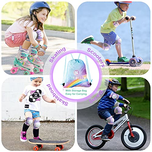 SULIFEEL Shiny Knee Pads for Kids Knee Elbow Pads Wrist Guards for Girls Boys Adjustable Protective Gear Set with Drawstring Bag Rainbow Unico