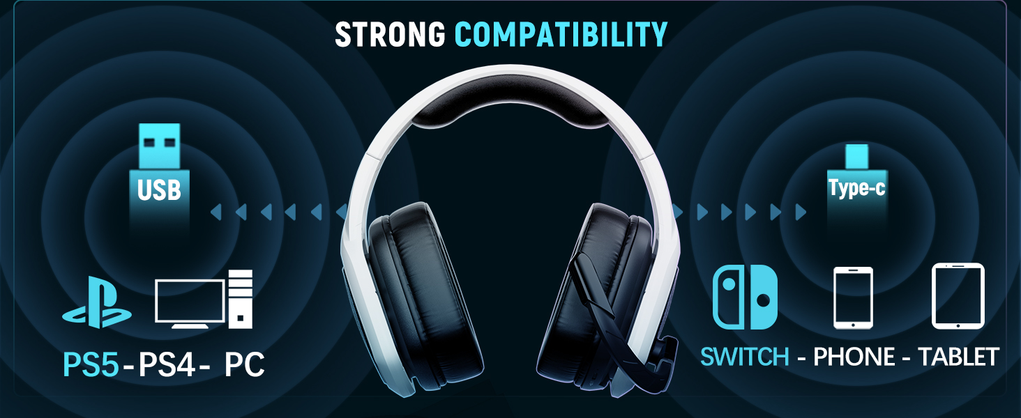 - Multi-Platform Compatibility: Equipped with a USB & Type-c 2Way 2.4GHz USB dongle, Bluetooth 5.3, and a 3.5mm jack, this Ps4 headset connects seamlessly to PC Ps4 Ps5 laptops Switch, and more. Its three connection modes meet diverse gaming needs, ensuring easy device compatibility.