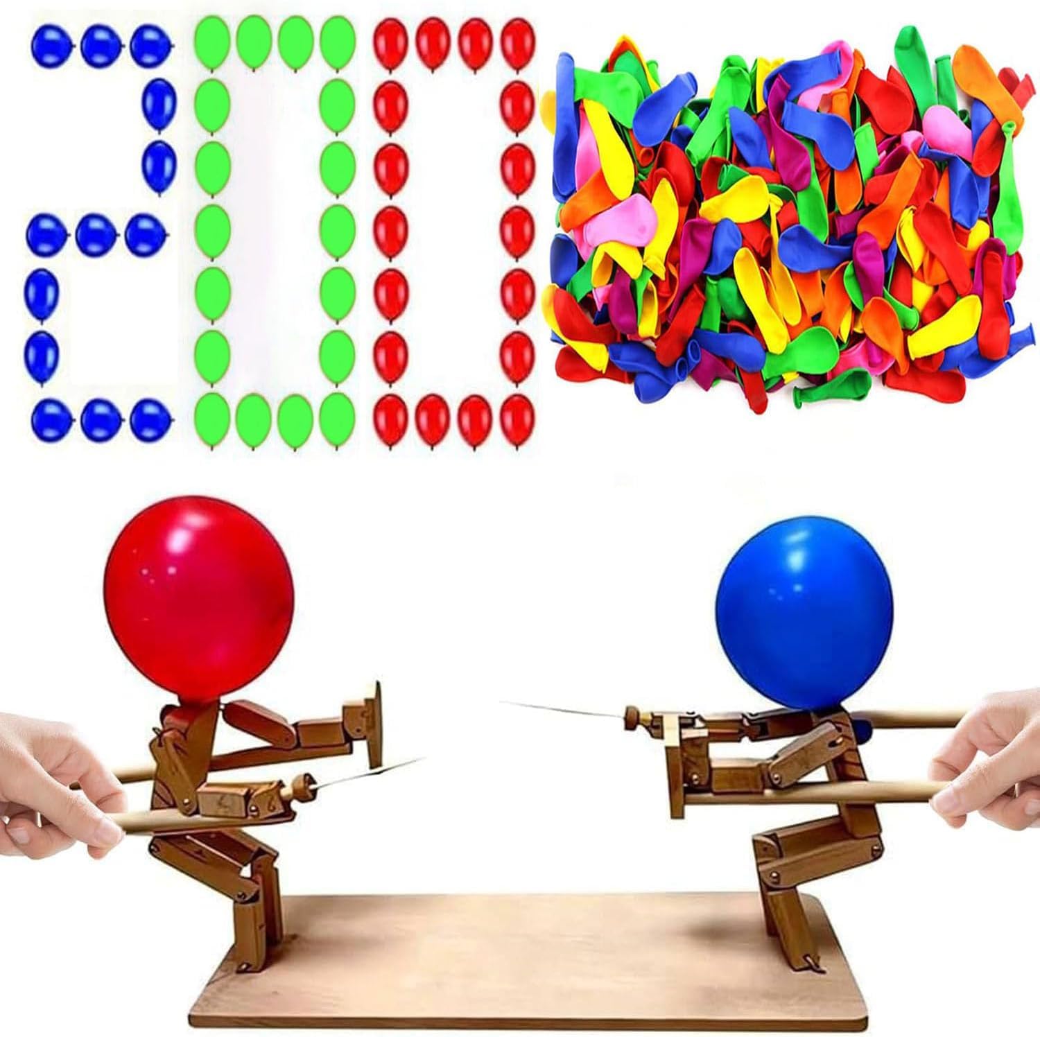 2 Player Balloon Bamboo Man Battle Game, 2025 New Balloon Game, Handmade Wooden Fencing Puppet Set for Exciting Balloon Battles, Fast-Paced Party Game for Kids and Adults (200 Balloons)