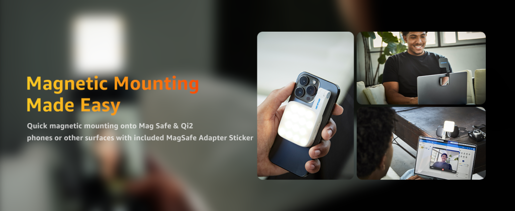 【Magnetic Mounting for Convenience】Easily attach the light to MagSafe or Qi2-compatible phones or devices. Includes a MagSafe Adapter Sticker to use on non-MagSafe devices like laptops for added versatility.