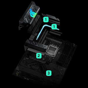 - VRM HEATSINK ARRAY: Two thick VRM heatsinks are connected by a heatpipe, sharing cooling capacity across VRMs and providing ample surface area and mass to handle the power needs of high-performance AMD Ryzen 9000 Series processors.