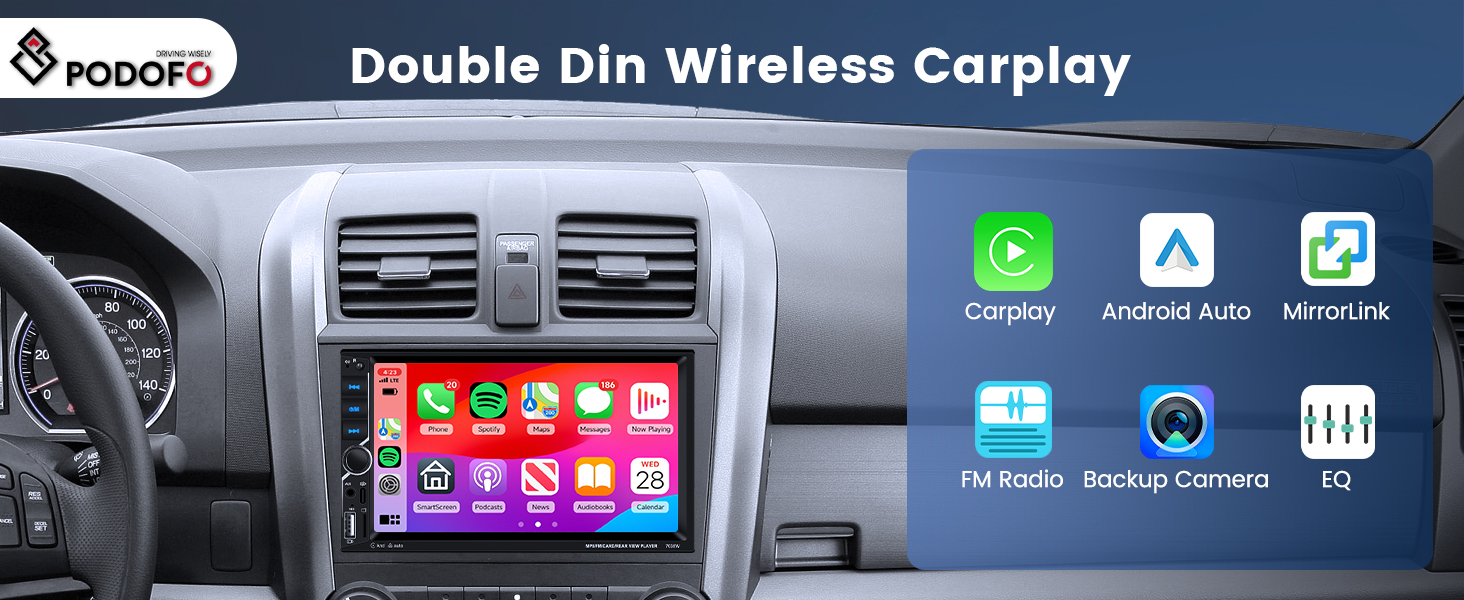 Double Din Car Stereo with Wireless Carplay Android Auto, Podofo 7 inch HD IPS Touch Screen Bluetooth Radio, Mirror Link, FM, EQ Audio, SWC, Backup Camera, External Mic, TF/Aux/USB+Type-C Ports