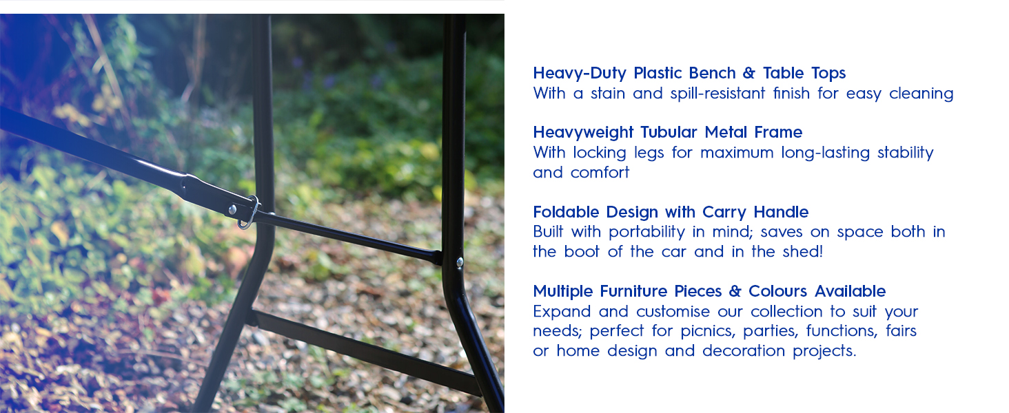 - The robust tubular metal frame can be easily opened and secured in seconds to provide a sturdy and secure surface that'll have you sitting pretty from first course to last!