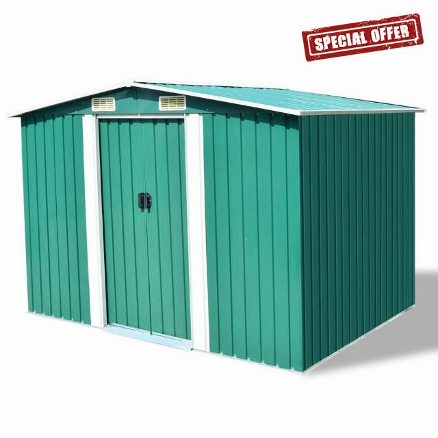 This metal storage shed will be perfect for storing a wide variety of tools and equipment. This storage shed has 4 vents, 2 in the front and 2 in the rear, ensuring excellent ventilation. The double sliding doors in the front allow easy entry and exit. The galvanised steel construction makes it durable and b, so it won’t corrode or be otherwise affected by extreme weather. It also includes a steel floor frame which adds stability and is perfect for a wood floor finish (wood not included). The pre-cut, pre-drilled parts and the included instruction manual ensure fast and easy assembly.Colour: GreenMaterial: Galvanised steelSize with roof: 257 x 205 x 178 cm (W x D x H)Slide door size: 80 x 154 cm (W x H)Ground surface area: 246 x 192 cm (L x W)Featuring 4 vents, each with a size of 23 x 10 cm (L x W)