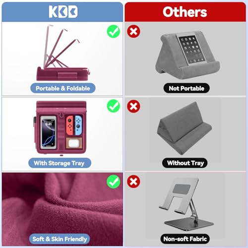 KDD Tablet Pillow Stand with Storage, Foldable Ipad Holder for Bed, Lap and Desk, Angle Adjustable Soft Pad Dock with Stylus Mount Compatible with Ipad Pro 12.9, 10.5, 11, Air, Mini, Phones