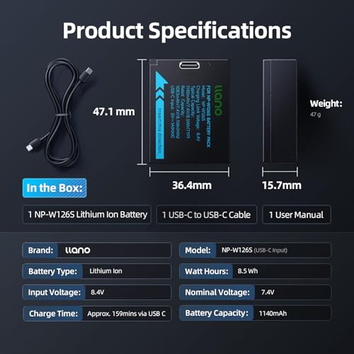 llano NP-W126S Battery Pack (USB-C Input) Compatible with Fuji X-T100, X-T200, X100F, X100V, X100VI, X-S10, X-A5, X-A10, X-E4, X-Pro2, X-Pro3, X-T1, X-T2, X-T3, X-T10, X-T20, X-T30 II – Black