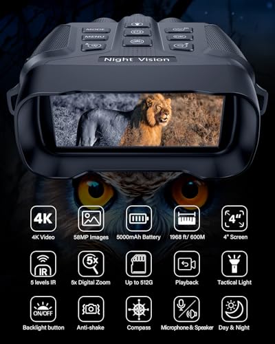 - [Perfect Gift for Outdoormen] Our night vision binoculars is equipped with shoulder straps and lanyards for easy wearing. The night vision telescope is applicable to night hunting, camping, night navigation, night fishing, wildlife viewing, forestry office, search and rescue, bird watching, landscape photography, etc. The digital 4K high-definition night vision device allows you to have a clear view like an owl in the dark! A suitable night vision scope for outdoor enthusiasts, hunters or security professionals.