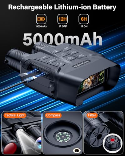 - [Rechargeable Night Vision Goggles] This night vision scope built in 5000mAh lithium-ion rechargeable battery, which can reduce your burden and no longer need to carry several AA batteries. Our night vision binoculars can shoot 18 hours of black and white images and videos in complete darkness on a single charge and can shoot stunning color Images and videos, daylight hours exceed 18 hours. It also comes with 64GB TF Cards, which can store video and pictures, you can also transfer them to your computer at any time.